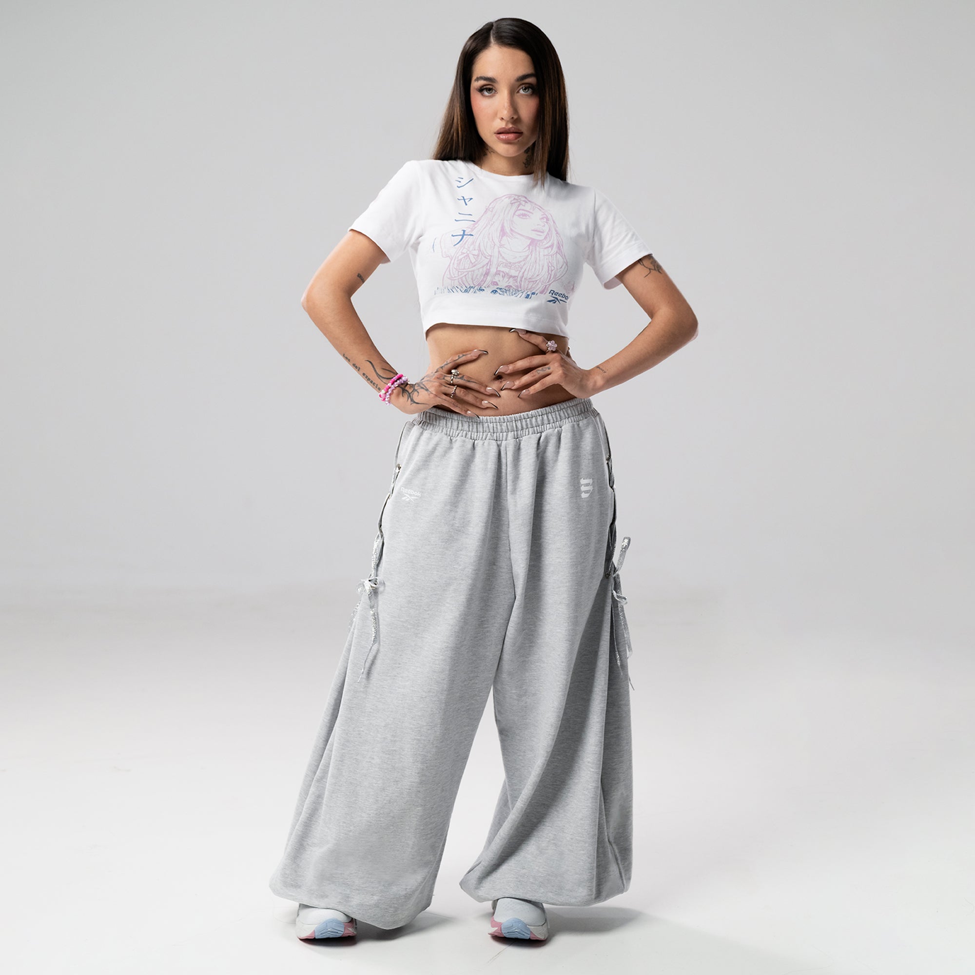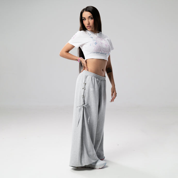 Es un pantalón oversize, de silueta super amplia, tiene ojalillos en los laterales para ajustar con un cordón de lurex con brillo. La composición es de algodón - rústico, en gris melange con presencia de logos, María Becerra y Reebok en una prenda única y versátil inspirada en el personaje Gladys de María Becerra.