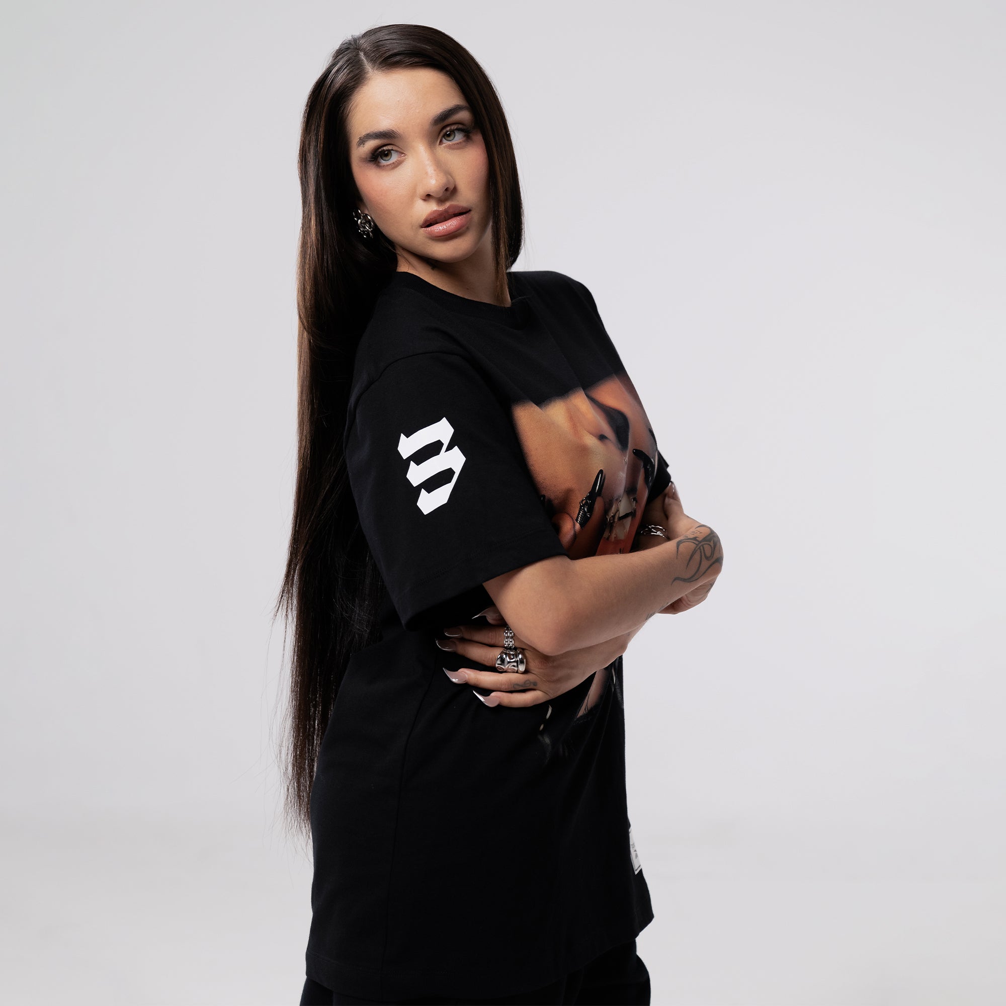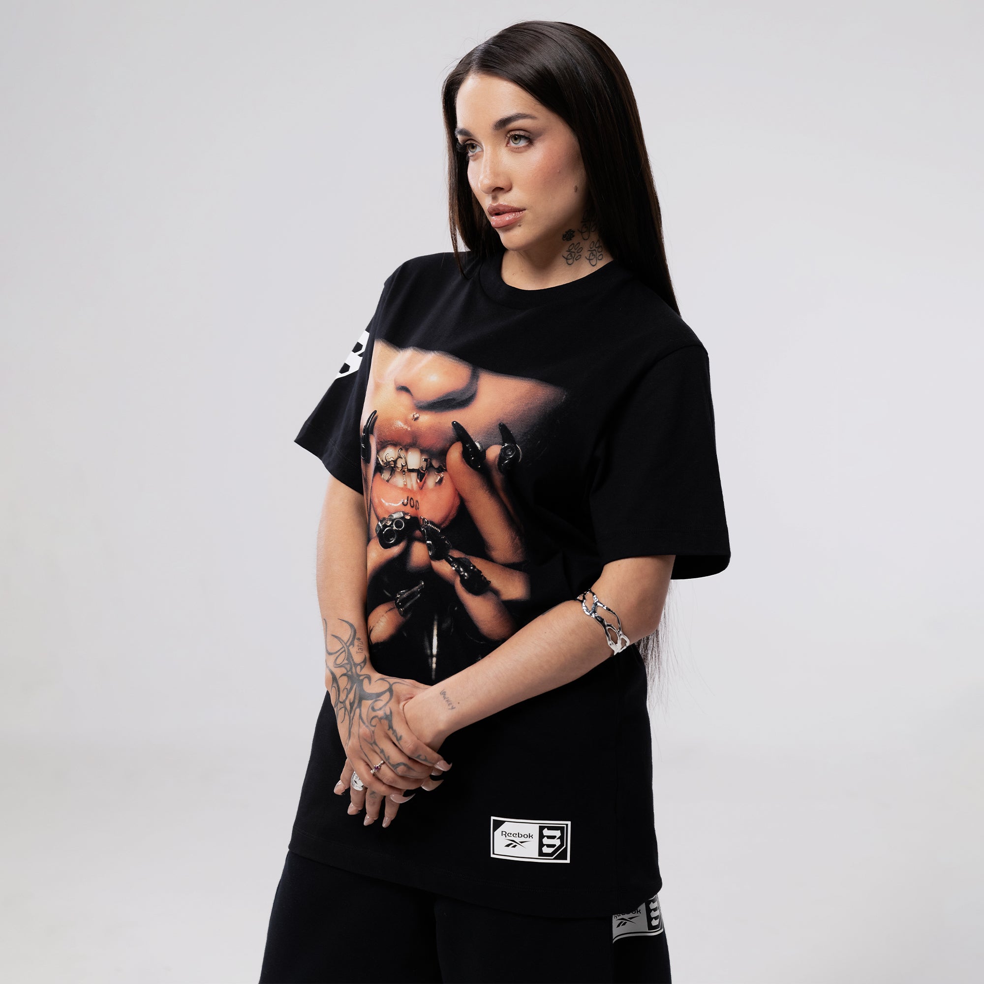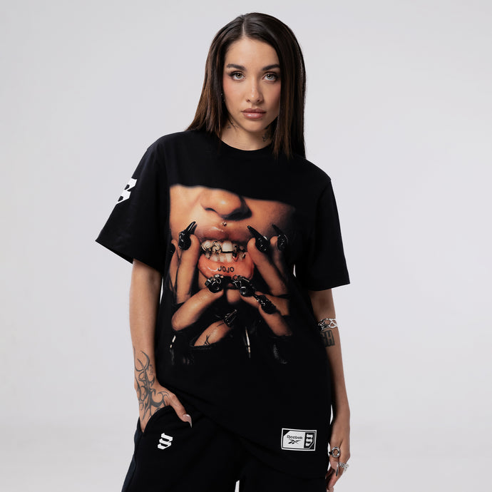 Es una remera de estilo oversize, con la imagen de la boca de JOJO, tiene el logo de María Becerra en la manga y etiqueta personalizada en la parte inferior- delantero. Es una prenda versátil, suave al tacto ya que su composición es de algodón.