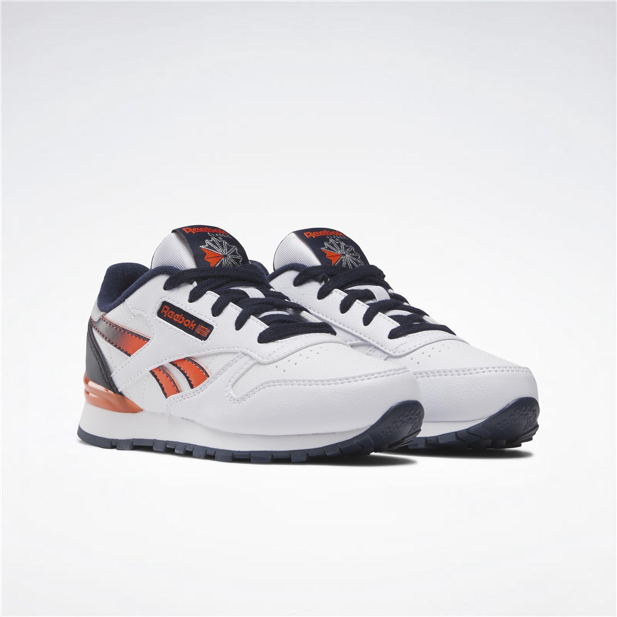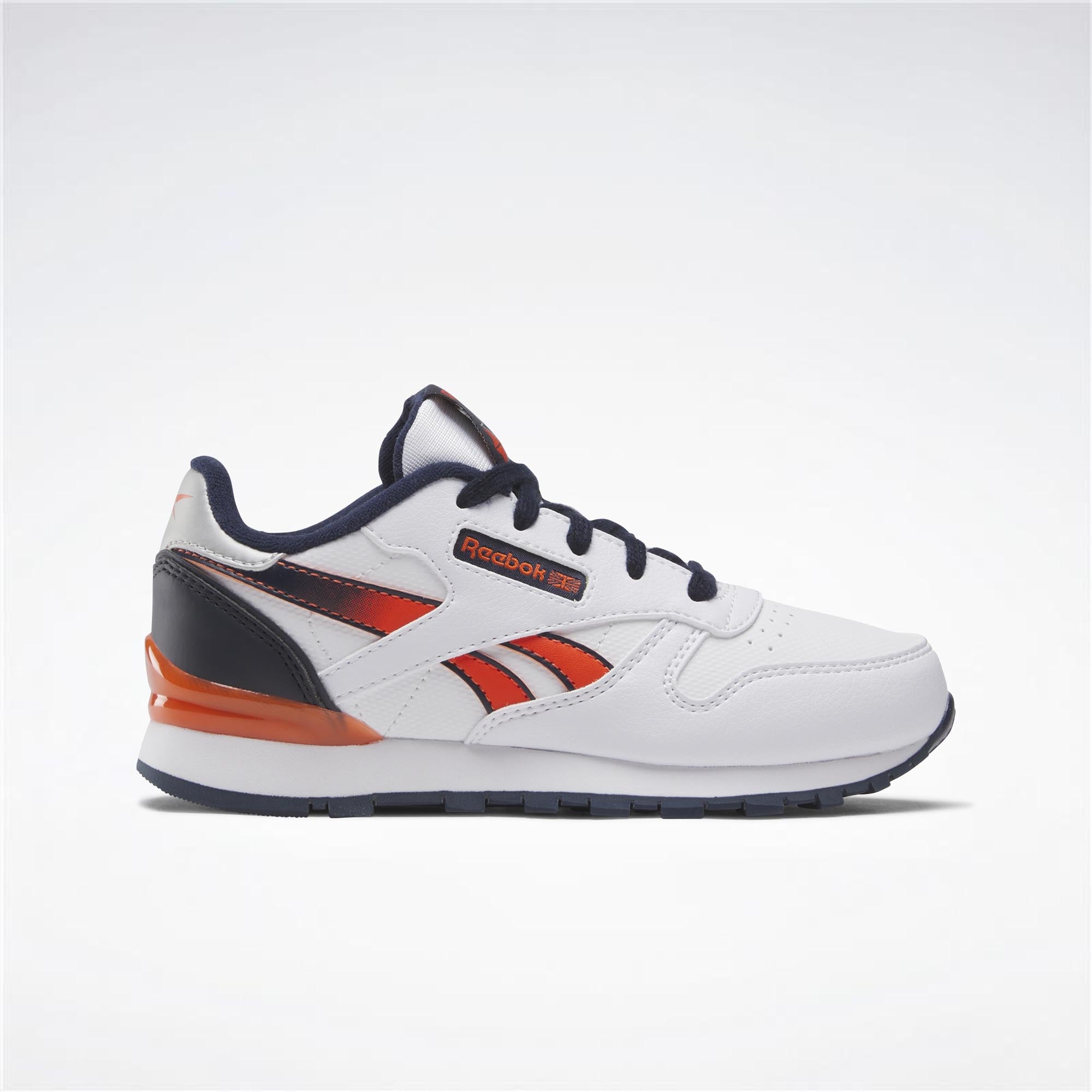 Zapatillas para niños con el logotipo de unión jack El diseño limpio y minimalista mantiene su aspecto siempre fresco. Estas zapatillas Reebok Classic Leather actualizan el estilo retro. Una parte superior de cuero flexible y logotipos extraídos de los archivos te brindan zapatillas que siempre funcionan, sin importar con qué las combines..