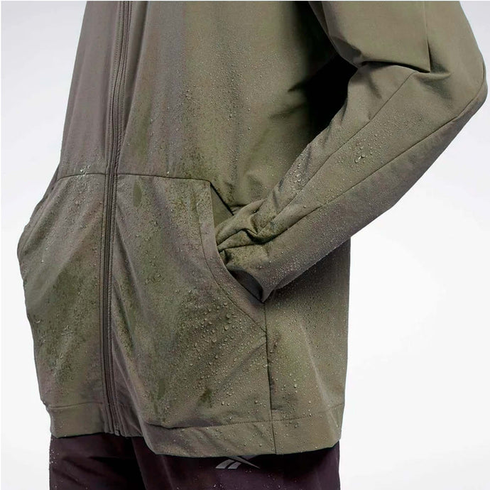 Abrígate para entrenar en climas fríos con esta campera de entrenamiento Reebok para hombre confeccionada con un tejido que capilariza el sudor. Y no te preocupes si llueve mientras estás afuera, porque el revestimiento repelente al agua duradero lo ignorará. Calienta tus manos entre repeticiones en los bolsillos laterales.